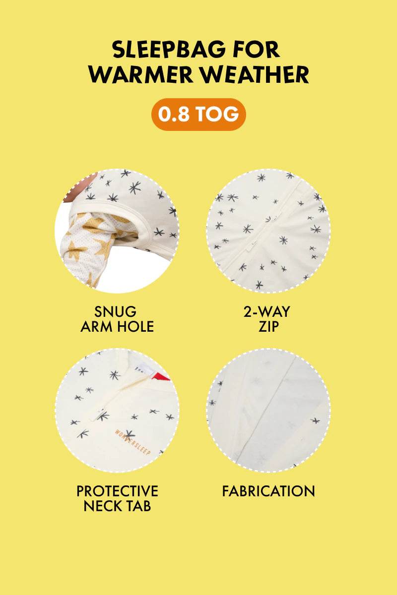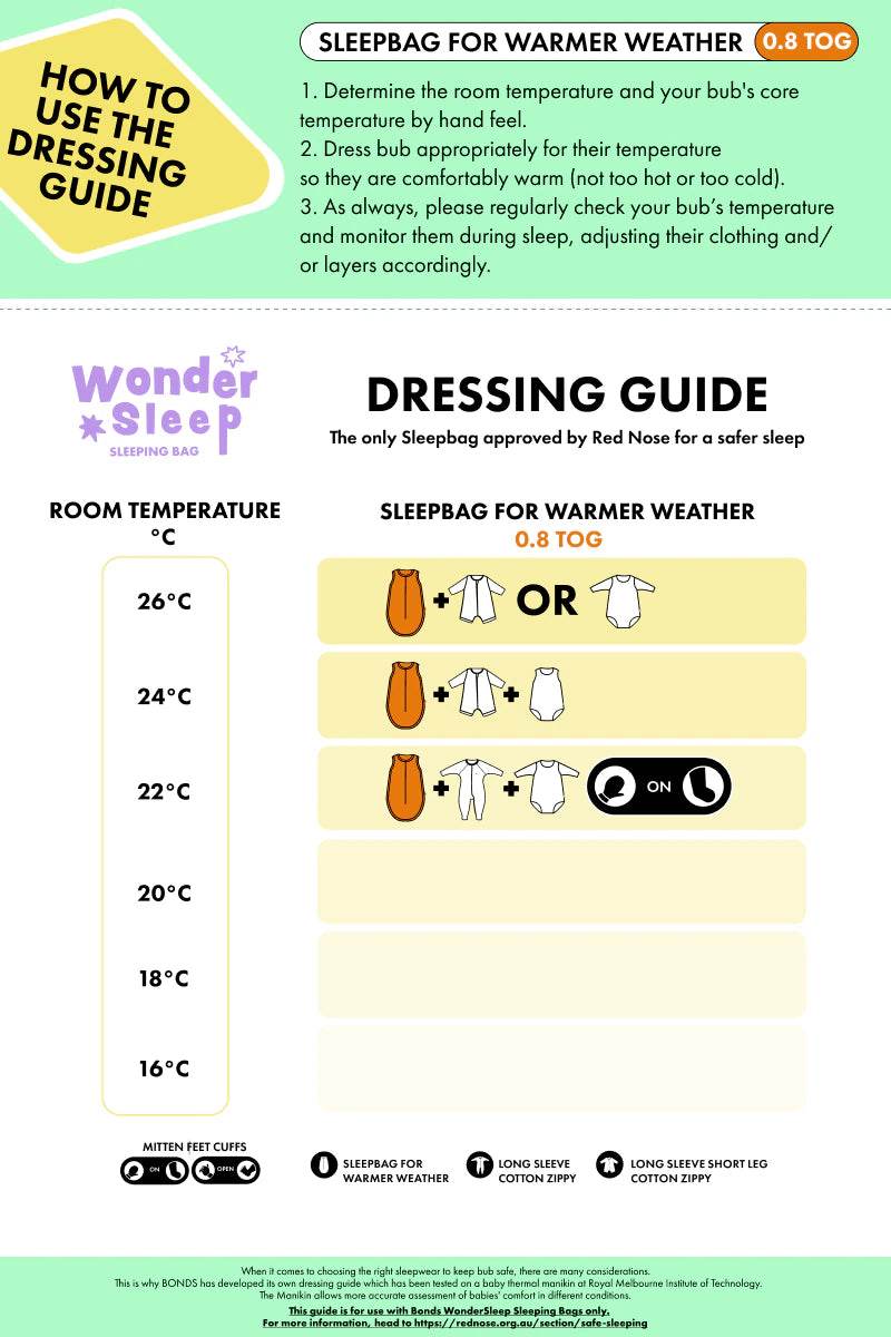 - • Stress-less dressing bub for sleep with a 0.8 TOG sleep bag perfect for temps between 22 and 26 degrees Celsius