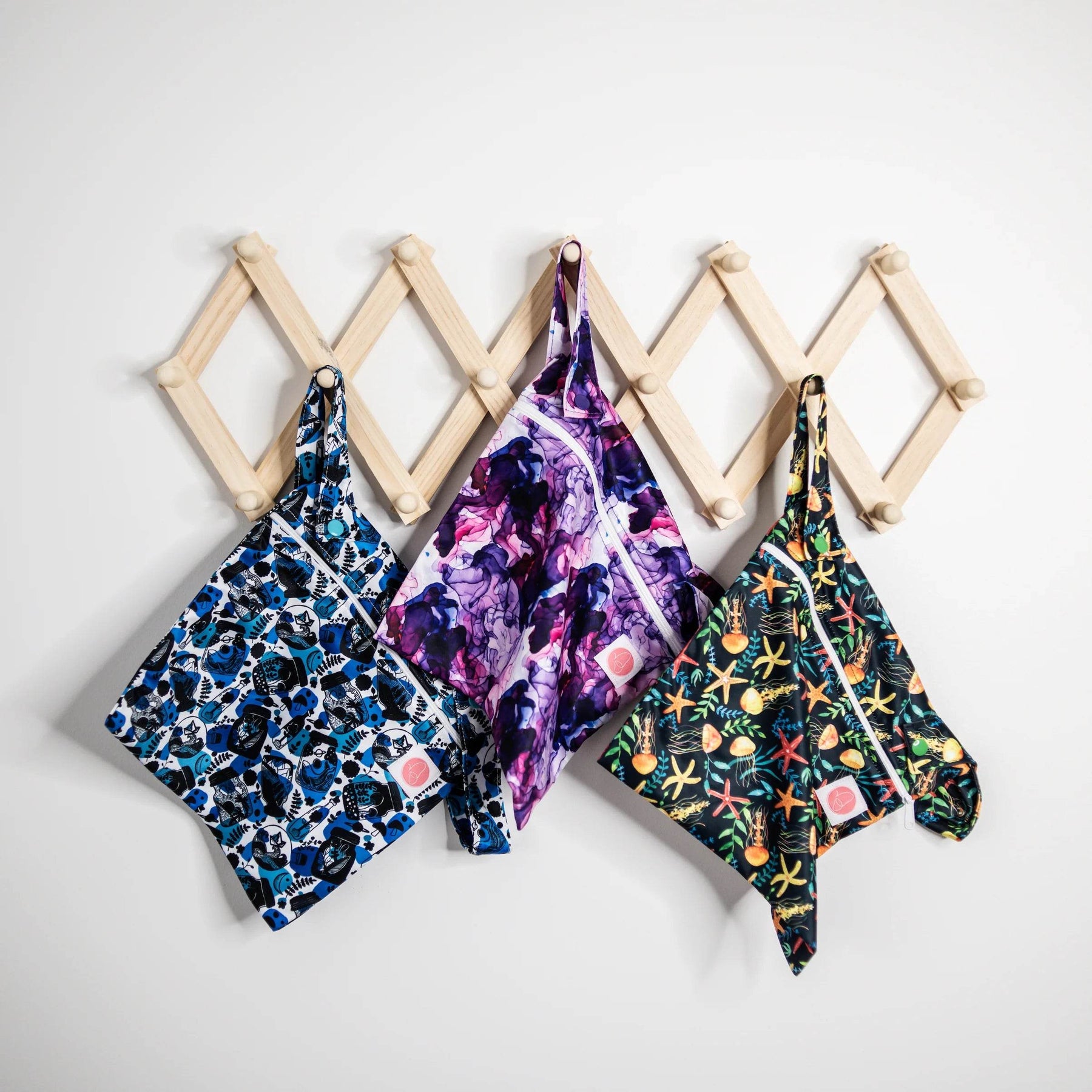 This Mini Wet Bag is an ideal travel companion. Its small size offers convenience while still providing enough room to store one dirty nappy and/or toys. Its snap-on handles make it easy to carry, wherever your travels take you.