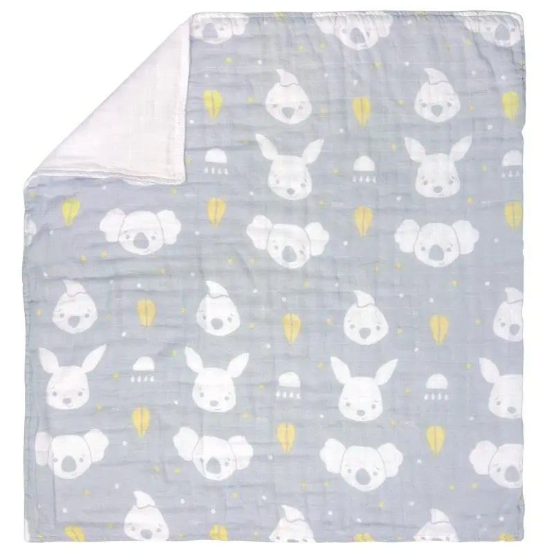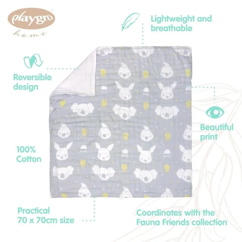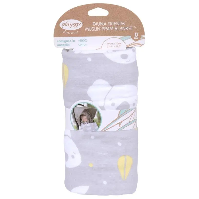 Give the gift of take anywhere comfort. Fauna Friends Pram Blanket is the perfect size, weight and design for on the go naps. Made from 100% cotton, it is lightweight, breathable and soft on baby's sensitive skin. A sweet print featuring fresh grey, white and yellow colours reflects Australian flora and fauna designs, perfect for every baby and every decor. Machine washable. Coordinates with the Playgro Home Fauna Friends textiles and toy range, for a beautiful nursery or keepsake gift. Key Features: - 100% soft, breathable, lightweight cotton - Convenient 70x70cm pram size - Folds to perfectly the diaper bag or under pram storage - Machine washable