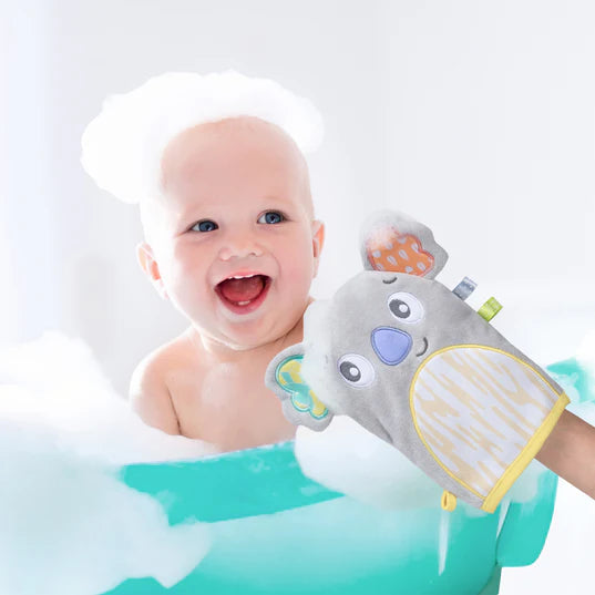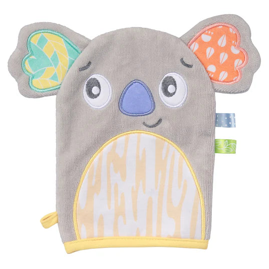 Bath time with a Koala! When its time for bubbles, Fauna Friends Koala Bath Mitt is there to help with the washing. This adorable Koala character engages baby and brings fun and giggles to bath time, reinforcing this positive experience and encouraging bonding between baby and parents. With the softest plush surface and made from 100% cotton, it is gentle on even the most sensitive skin. Features looped ribbon and tactile ears to encourage grasping, contrasting eyes and friendly face and a convenient loop to allows the mitt to be easily hung to dry at the end of bath time. Contemporary colours and prints are great for baby's visual development and coordinate this mitt perfectly with our extensive Playgro Home Fauna Friends range. A lovely gift paired with our matching Hooded Towel.
