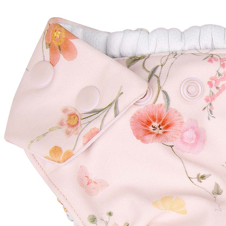 Swim Nappy Maya features an original and exclusive Toshi print design, a collection of sweet field flowers are presented in a delightfully pretty pink hue.