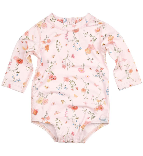 The beauty, functionality and elevated quality for which Toshi is traditionally renowned, is crafted into an exquisite baby swimwear collection. Rated UPF 50+, Toshi Swim offers maximised sun protection and water safety. The finest quality fabrication is fast drying and chlorine & salt water friendly. The adorable Toshi seamless Swim Onesie features bottom opening press studs for ease of nappy change and back neck zip for ease of dressing. A high neckline and long sleeves ensure greater sun protection. An original and exclusive Toshi print design is featured.