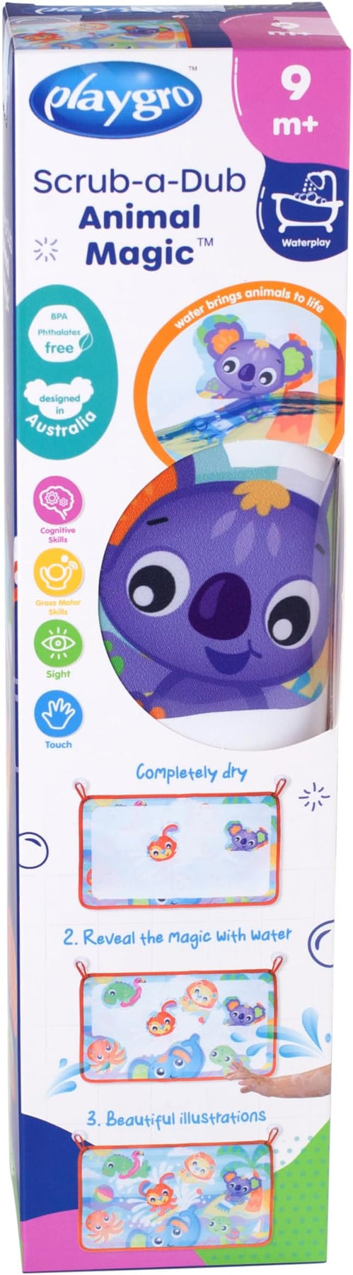 Make bath time magical with Playgro's Scrub-a-Dub Animal Magic! Use the soft scrubby animal to reveal hidden characters on the magical board, turning every bath into a colourful adventure. Bright colours stimulate visual development, and the suction cups make it easy to attach the board to the side of the bath wall. Perfect for bath time or floor play, babies can use their fingers to add water and watch the magical scene come to life. As they grow, your little one can use the scrubby plush character to reveal even more colour magic.