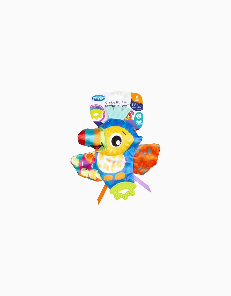 Cuddle up with Playgro's Crinkle Blankie Tamika Toucan, your baby’s new snuggly sidekick! This adorable blankie makes delightful crinkle sounds that keep little ears entertained. The soft, chewy teether is perfect for soothing sore gums, while the bright and colourful design brings a burst of visual joy. With a plush head and body, Tamika is made for cozy cuddles. Her silky sateen wings and beak add a playful pop of colour, and the reversible black and white patterns help boost visual development. Crinkle Blankie Tamika Toucan makes every cuddle a fun and sensory-filled adventure!