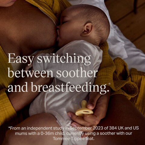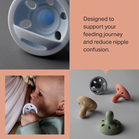 Soft to touch and barely-there, this soother looks and feels like a breast. With a familiar shape and skin-like feel, it's made to support your feeding journey, and specially designed to help reduce nipple confusion with continuous comfort and a natural latch.